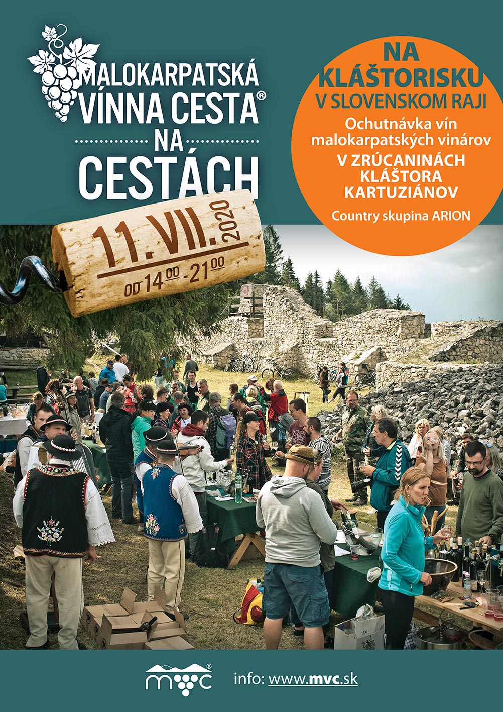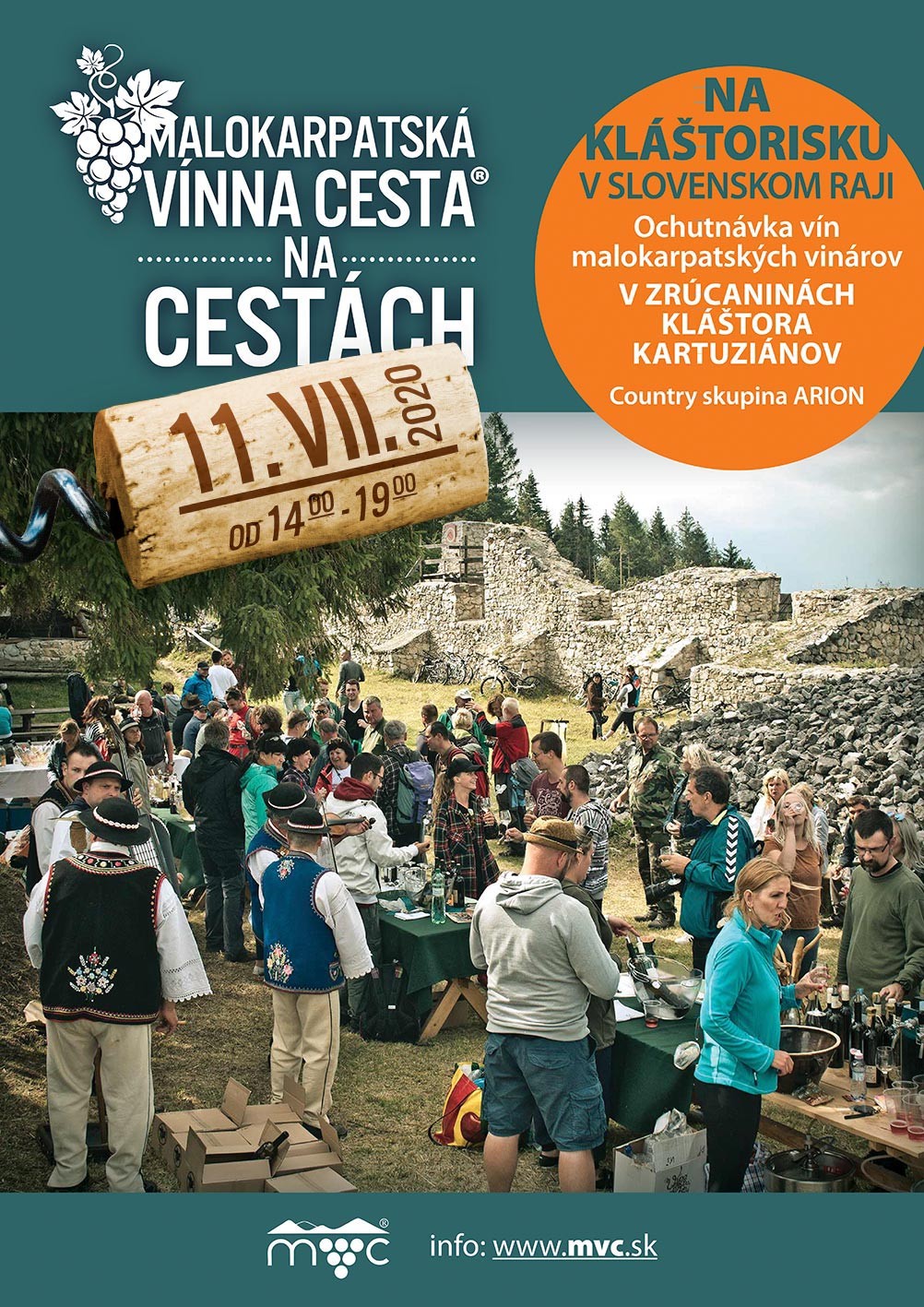 Druhá zastávka bude v sobotu 11. 7. na Kláštorisku – ktoré je označované aj ako srdce Slovenského Raja. Nachádza sa tu ruina kartuziánskeho kláštora z 13. storočia. Je to planina uprostred vodopádov, skál a rebríkov. Kláštor vybudovali mlčanliví kartuziánski mnísi. Na Kláštorisko sa dostanete za hodinku aj za pol dňa, záleží len na tom odkiaľ vyrazíte – v tento deň tu však okrem zrúcanín kláštora čaká na bielo prestretých stoloch široká ponuka vín malokarpatských vinárov – osobne ho ponúknu: Račianska vinotéka a Kollár vineyards & winery, Vinkovič – vinohradníctvo a vinárstvo, Sommini winery, Pegas - Peter Gáži a syn, Vinárstvo Dobrý pocit, Víno Hugo a Vinárstvo Stevino. Túto výnimočnú degustáciu sprevádza Country skupina ARION.