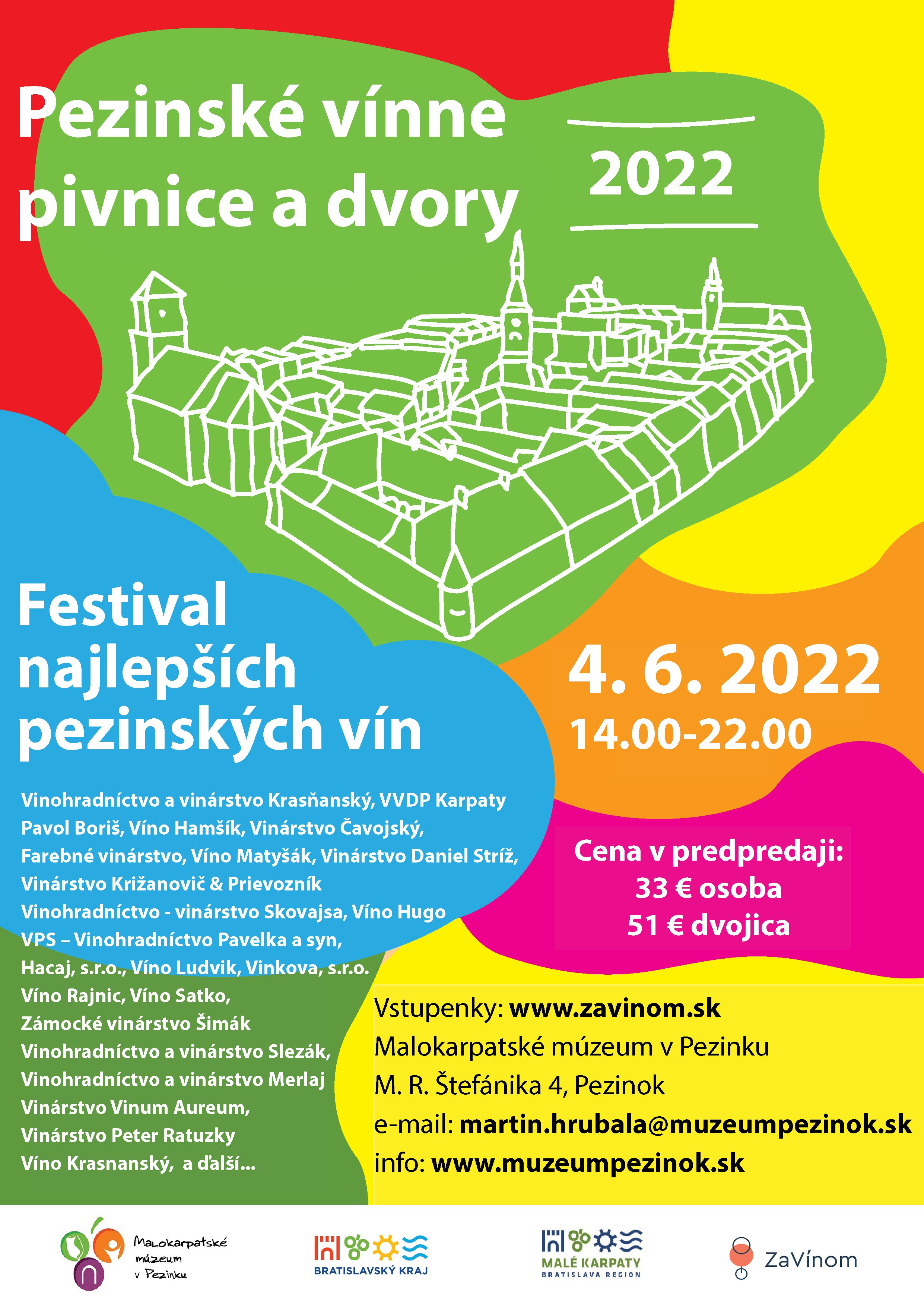 s radosťou Vám oznamujeme, že štrnásty ročník podujatia Pezinské vínne pivnice a dvory 2022 sa uskutoční v sobotu, 4. júna 2022 v čase od 14.00 h. do 22.00 h. V širšom centre mesta Pezinok na jednotlivých zastávkach členovia Združenia pezinských vinohradníkov a vinárov ponúknu to najlepšie, čo ukrývajú ich pivnice a dvory. Spojte putovanie za výborným vínkom s prehliadkou mesta a jeho historických zákutí.