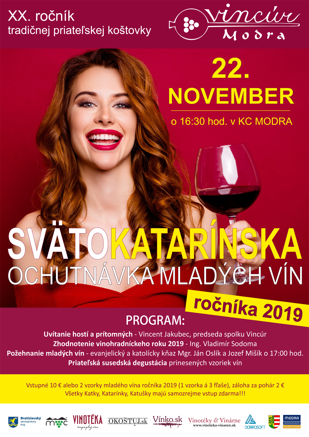 Občianske združenie: Vincúr, spolok vinohradníkov a vinárov v Modre Modra organizuje tento rok už XX. ročník tradičnej priateľskej koštovky pod názvom „Svätokatarínska ochutnávku mladých vín ročníka 2019".