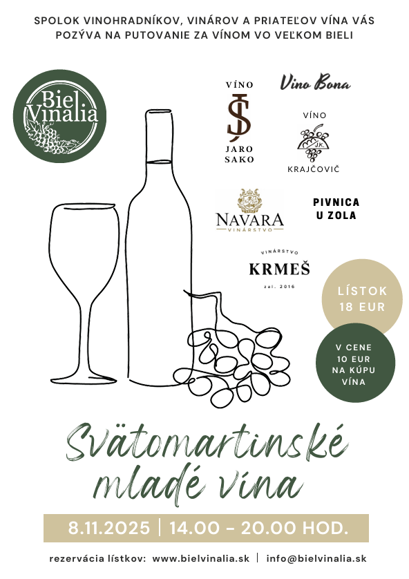 Spolok vinohradníkov, vinárov a priateľov vína vo Veľkom Bieli Vás srdečne pozýva na podujatie Svätomartinské mladé vína 2025, počas ktorého máte možnosť nahliadnuť do pivníc bielskych vinárov a ochutnať množstvo vynikajúcich vín, vrátane tohtoročných noviniek.