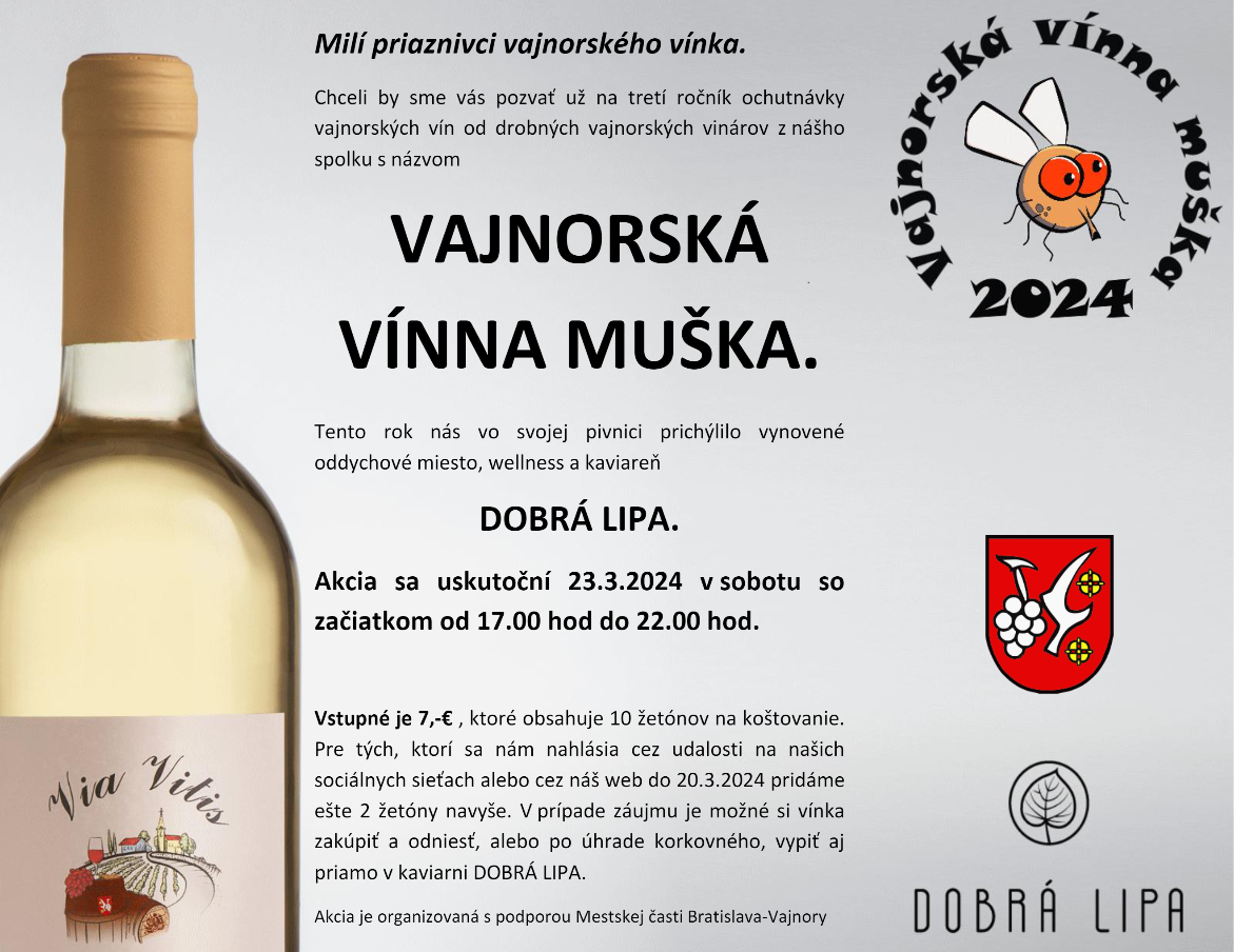 Jedná sa o ochutnávku vín od vinárov z nášho Vajnorského vinohradníckeho spolku- Via Vitis vo Vajnoroch. Je to akcia, kde vám chceme za prvé predstaviť aký bol predchádzajúci rok z pohľadu úrody a kvality vín z nej urobených, ale súčasne chceme vždy predstaviť nových členov - vinárov, ktorí sa v priebehu roka pridali ku nám, alebo s nami úzko spolupracujú. Chceme takouto komornou formou sa prezentovať a súčasne podporiť ďalších vinárskych záujemcov o spoluprácu s naším spolkom. Zatiaľ je to rozsahovo skôr menšieho charakteru a preto ďakujeme aj majiteľom kaviarne Dobrá Lipa, že nás prichýlili vo svojich vynovených priestoroch.